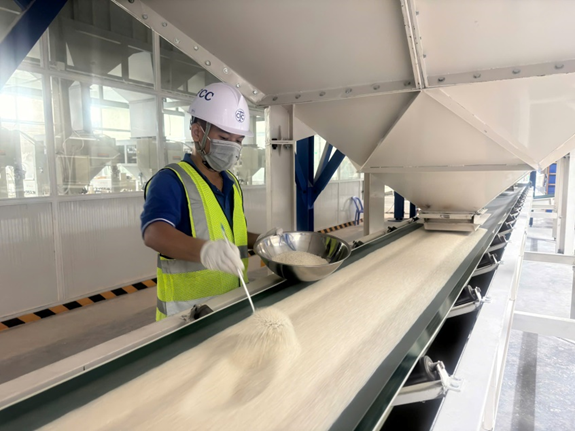 Giám định viên phân tích mẫu gạo tại kho hàng / nhà máy